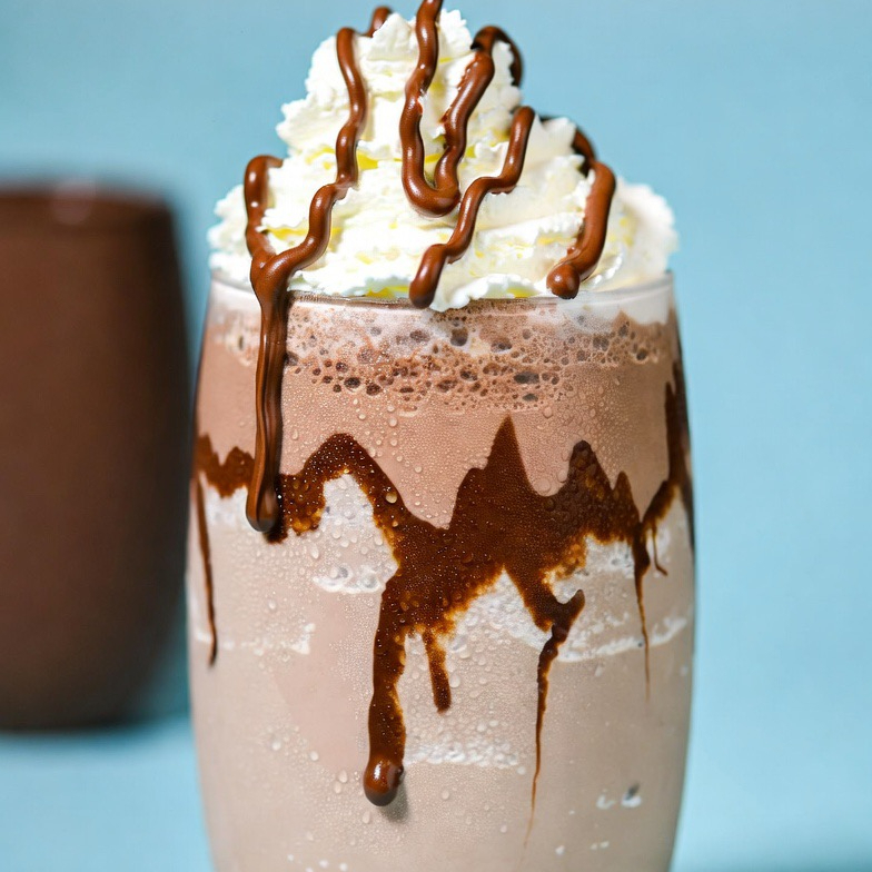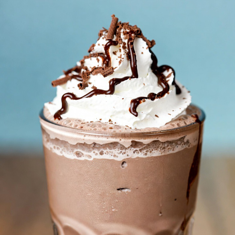 Chocolate gourmet, leche hielos, decorado con crema batida, cocoa y jarabe de chocolate