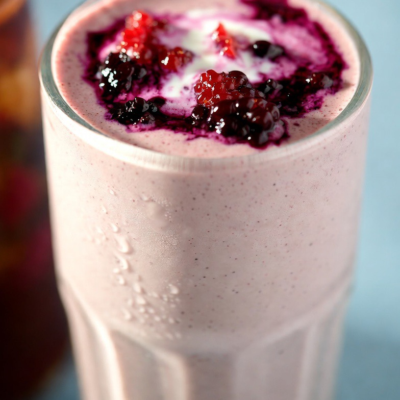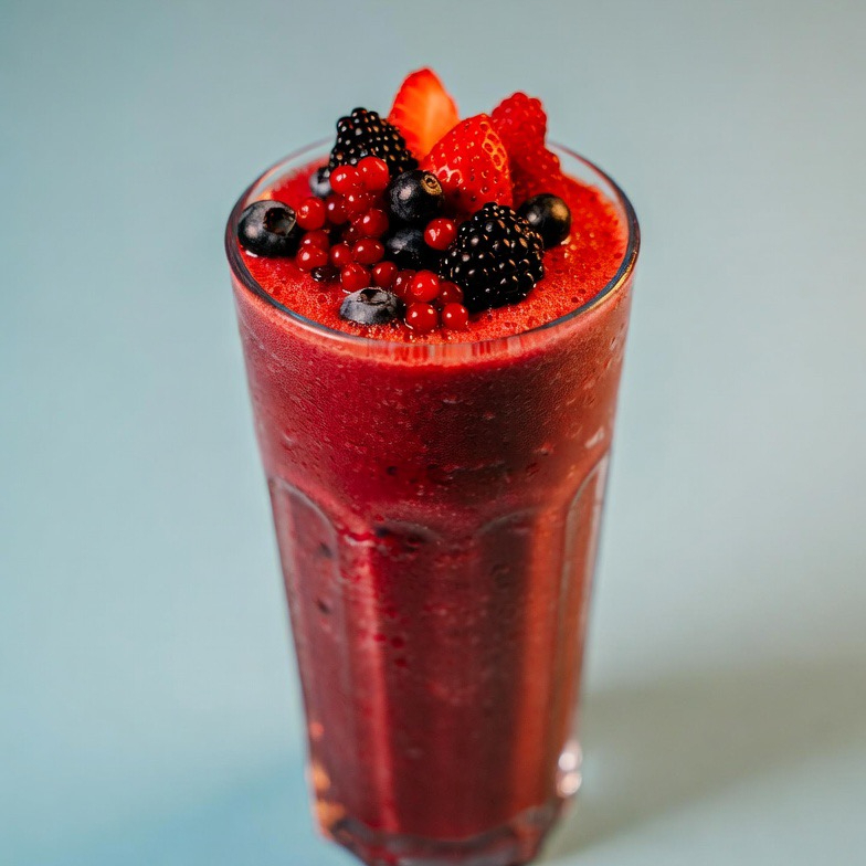 Yogurt natural, pulpa de frutos rojos, hielos, decorado con frutos rojos