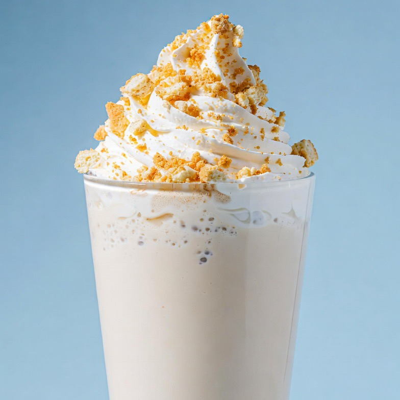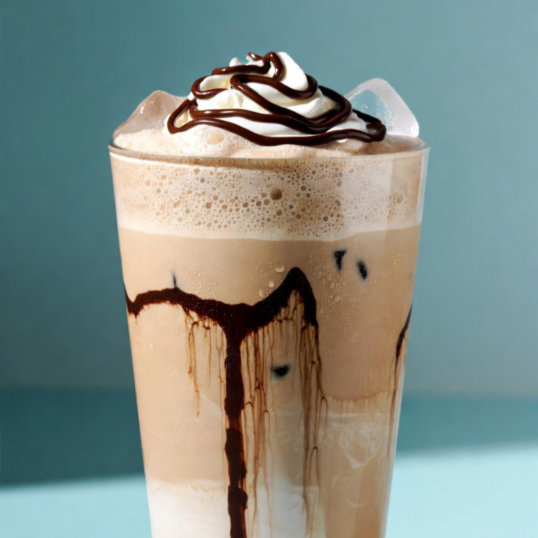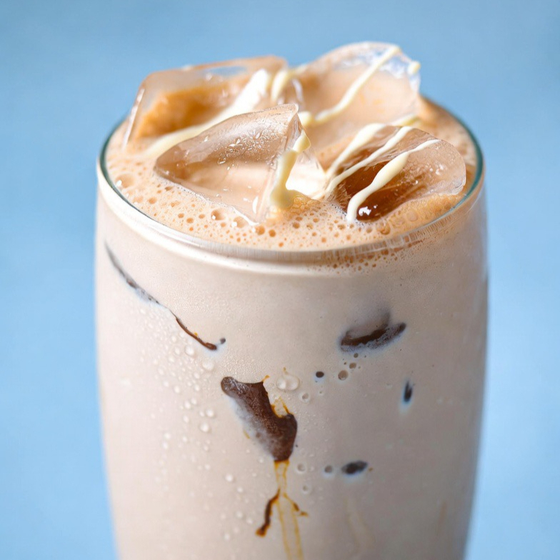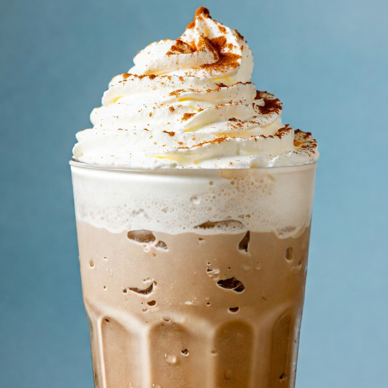 Chocolate blanco, espresso, leche, hielos, decorado con crema batida