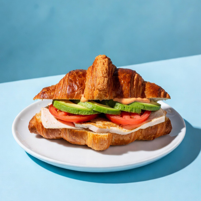Croissant, jamon de pechuga de pavo, aguacate, mayonesa, jitomate queso panela, aderezo chipotle suave
