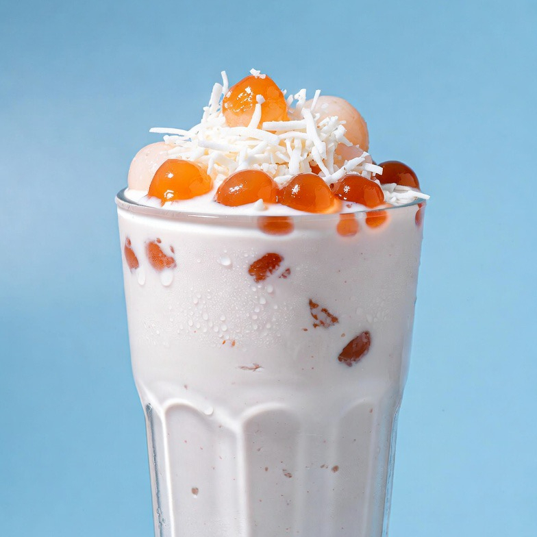Pulpa de coco, perlas de lyche, leche de coco, hielos, decorado con coco rayado