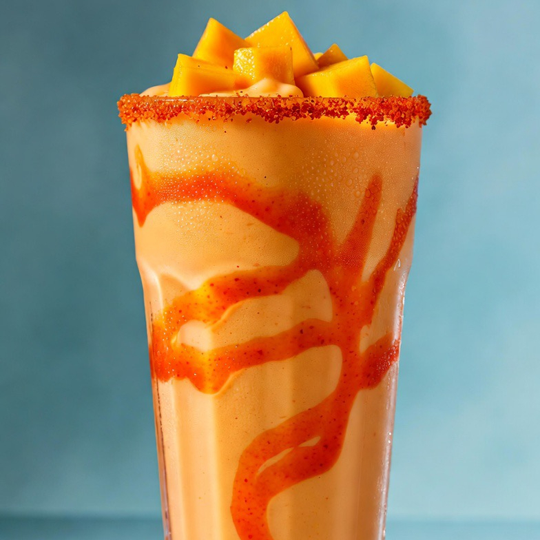 Pulpa de mango, hielos, base de agua, decorado con chamoy liquido y tajin de tamarindo