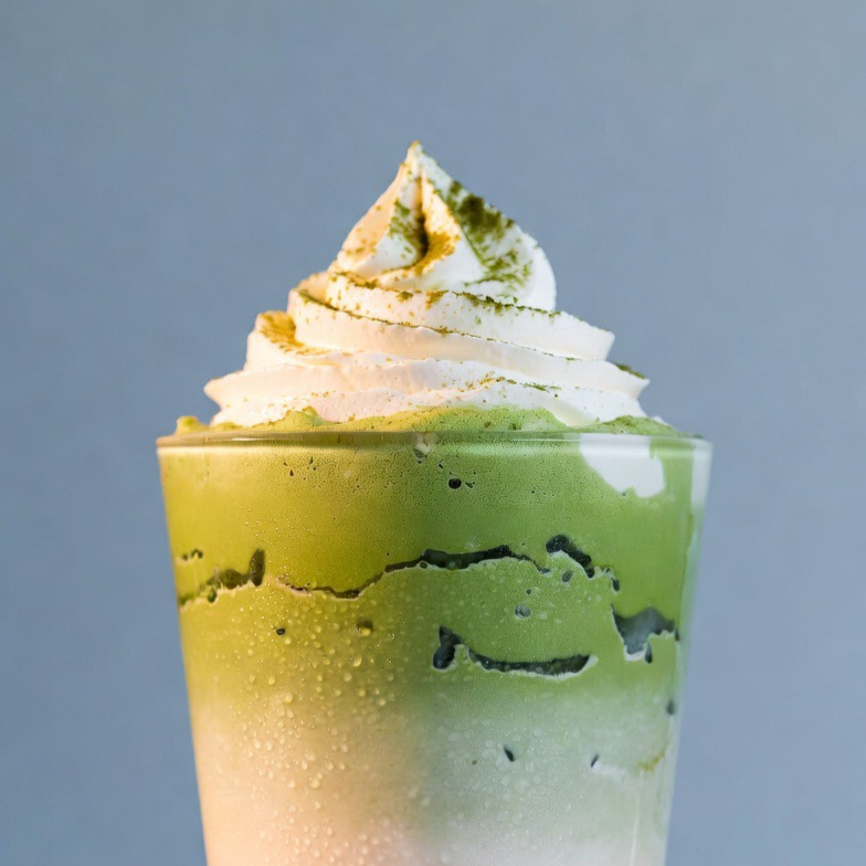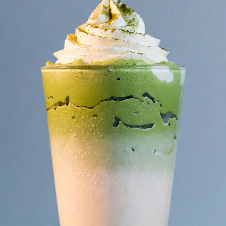 Matcha premium, con jarabe de hierbabuena, molido con chispas de chocolate, leche y hielos, decorado con crema batida y chocoretas