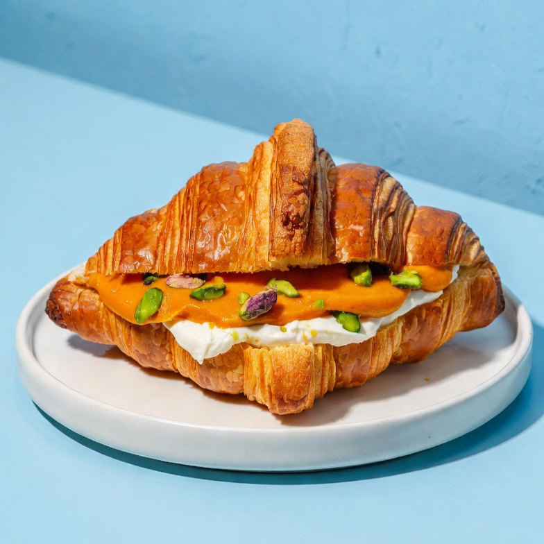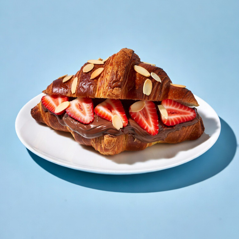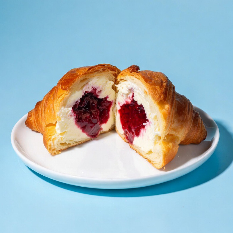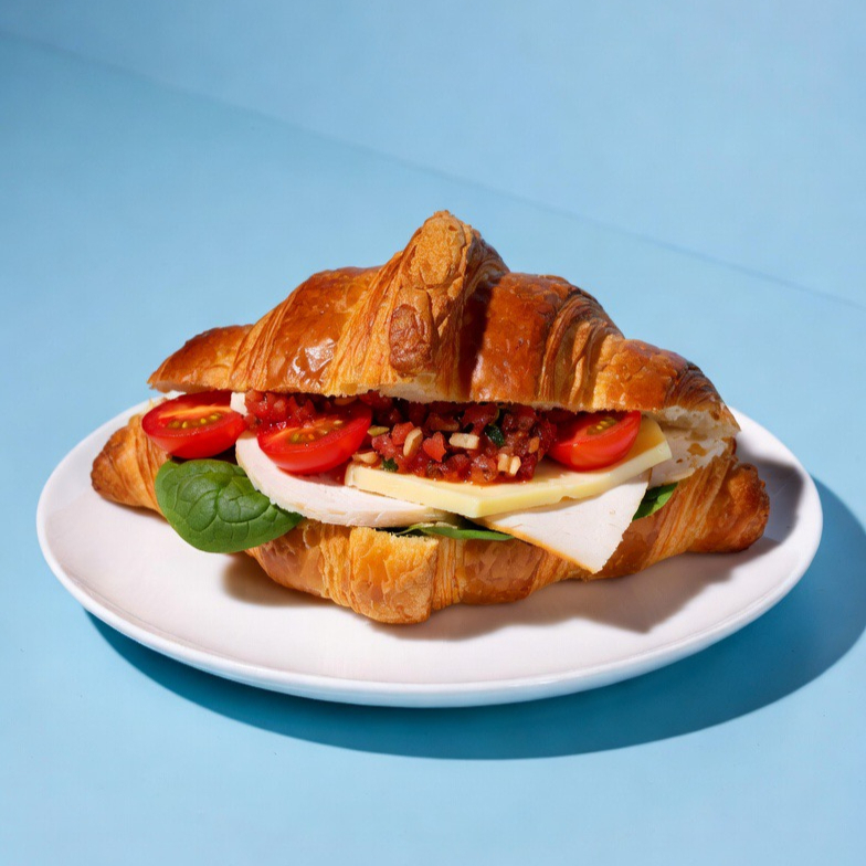 Croissant, salsa jitomate italiana, queso panela, jamon de pechuga pavo, espinacam jitomate cherry