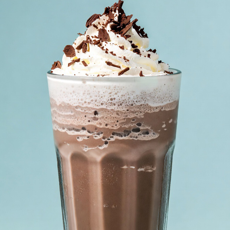 Jarabe de menta, chocolate oscuro, leche y hielos