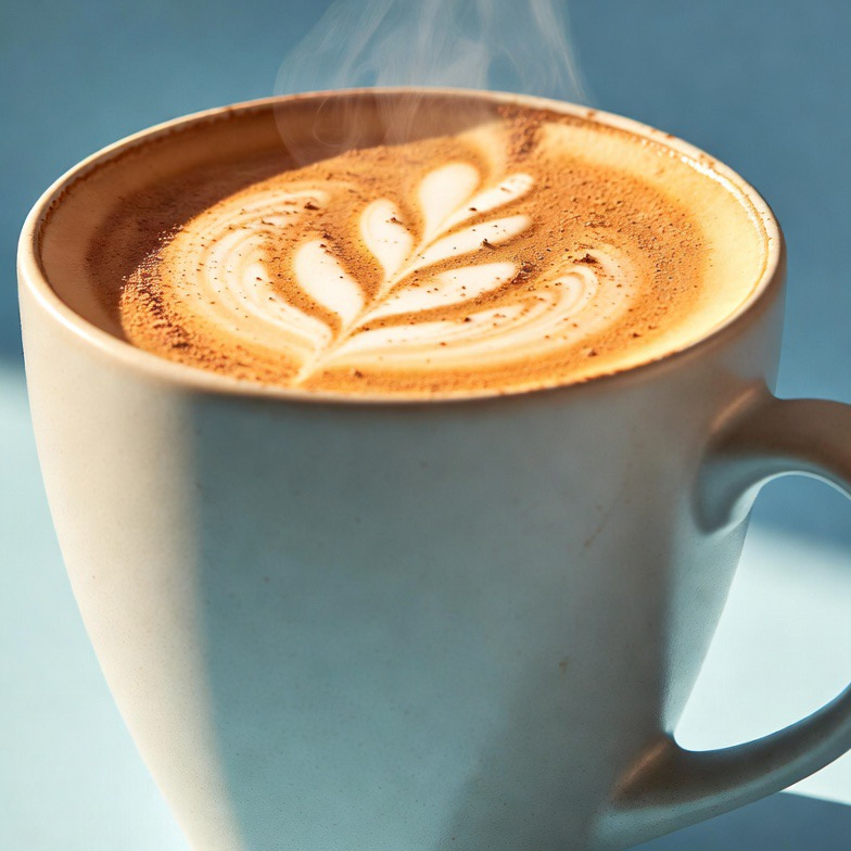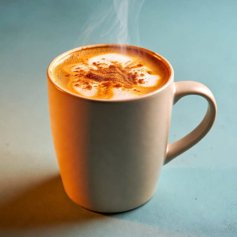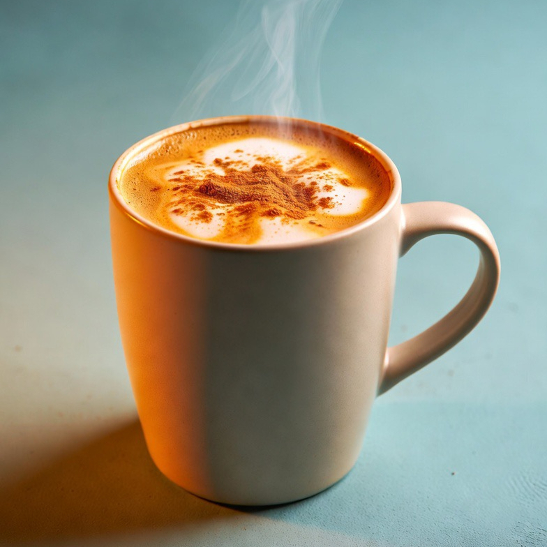 Espresso con leche vaporizada y generosa capa de espuma blanca cremosa, decorado con un toque de canela espolvoreada.