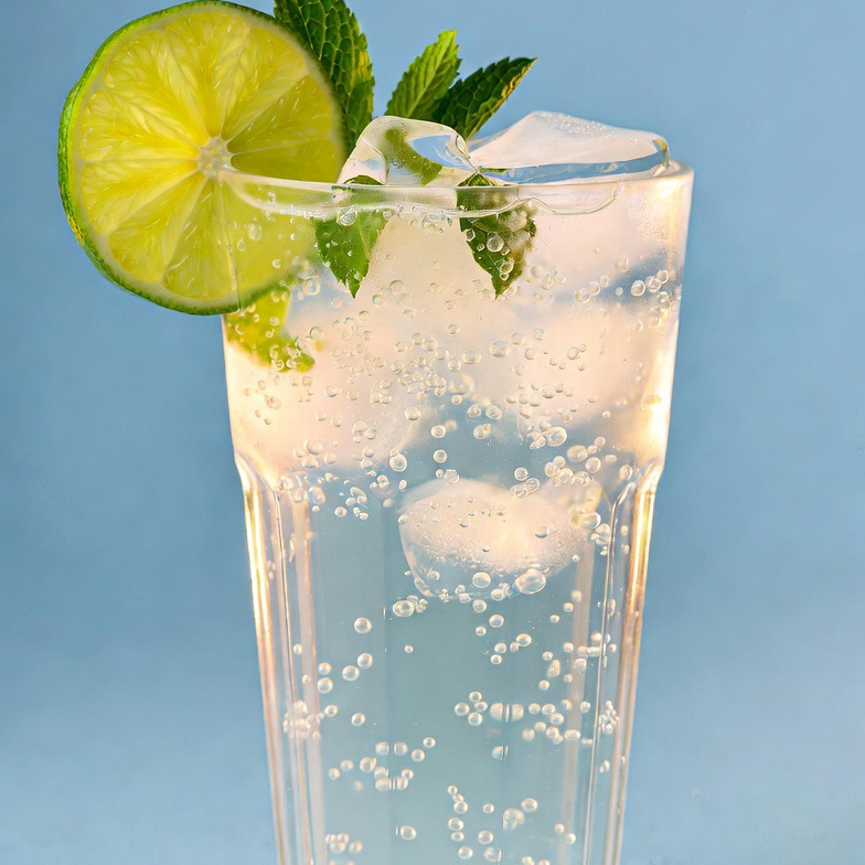 Agua gasificada sabor, limon, toronja o naranja, decorada con frutos citricos deshidratados y hielo