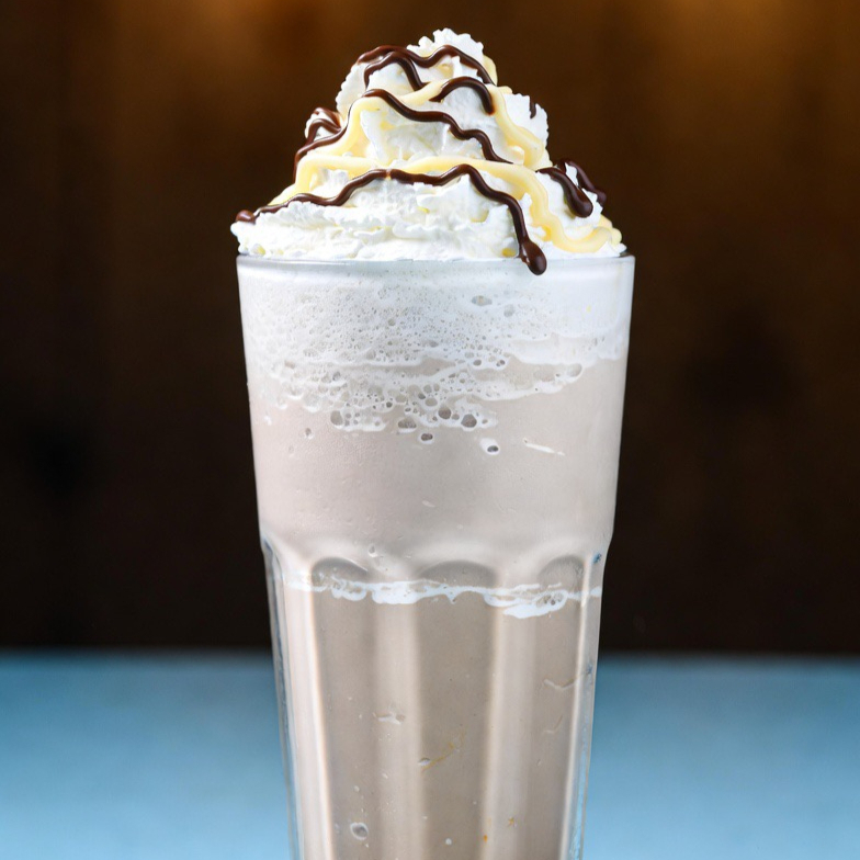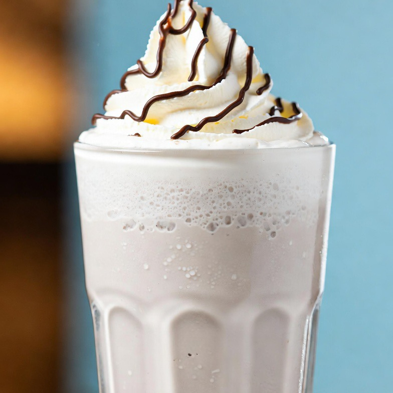 Chocolate blanco, leche, hielos, decorado con crema batida y chocolate
