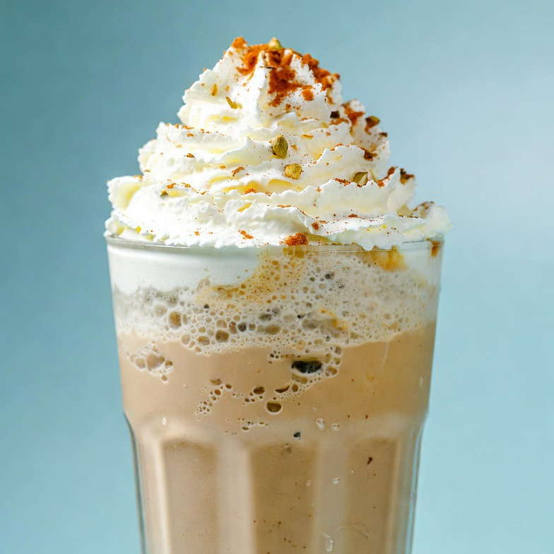 Chai especiado, leche, hielos, decorado con crema batida y un toque de canela