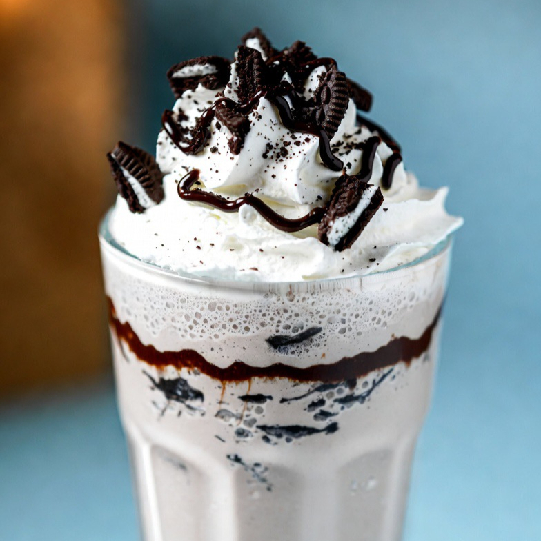 Galleta oreo, leche, hielos, decorado con oreo y chocolate