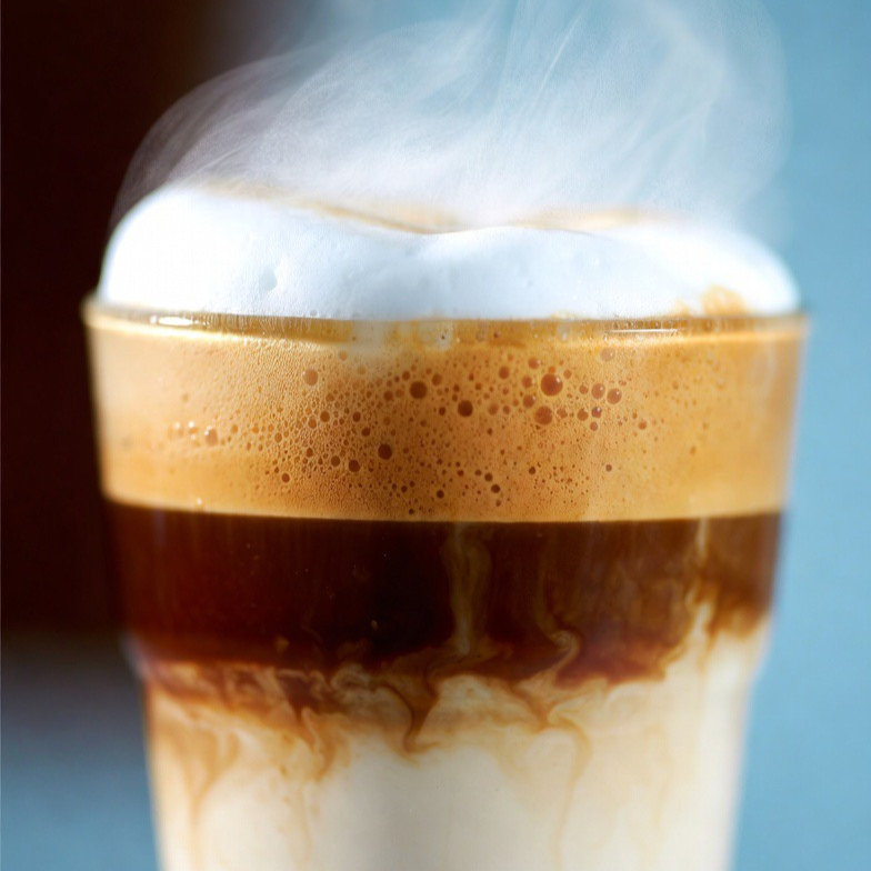 Espresso conap chocolate blanco cremoso y leche vaporizada.