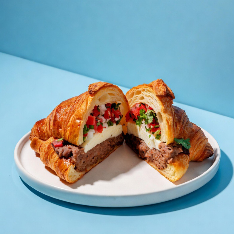Croisssant, chorizo, frijoles refritos, queso manchego y pico de gallo