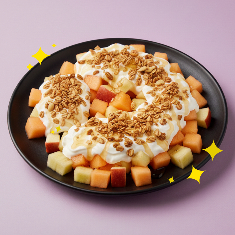 Con miel de agave, granola y yogur. Hecho con fruta de temporada.