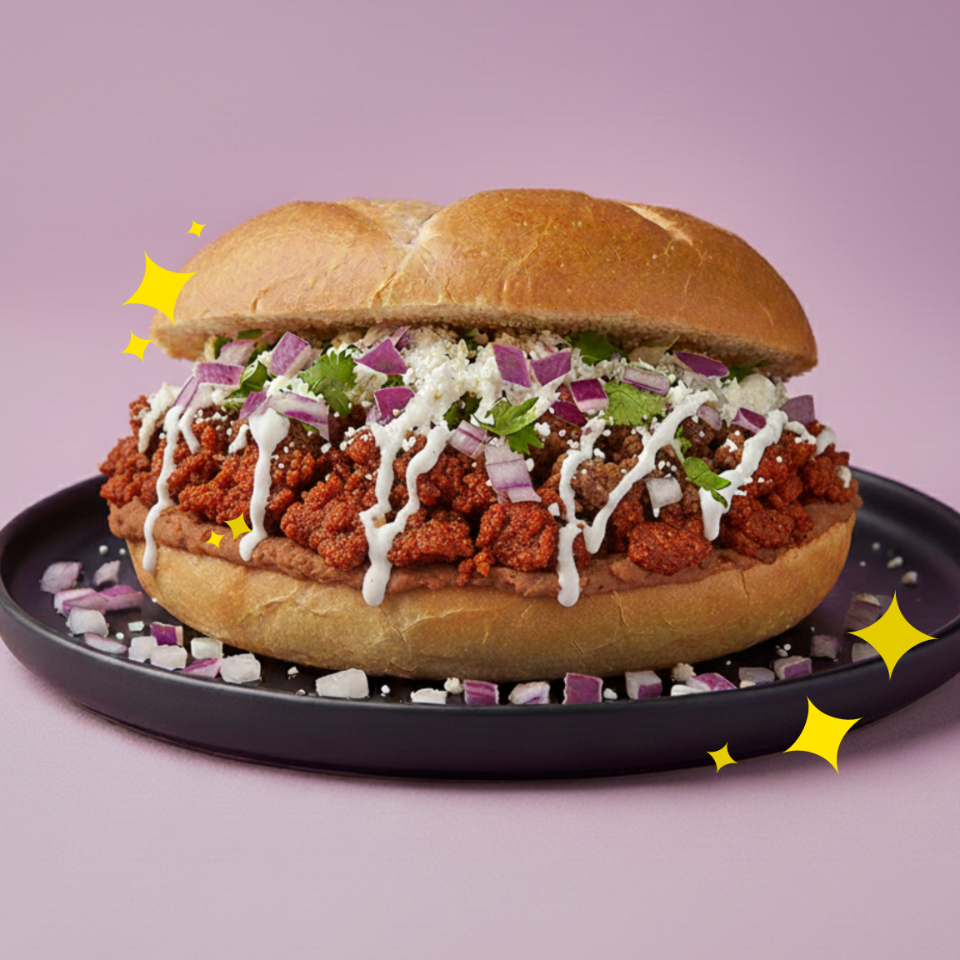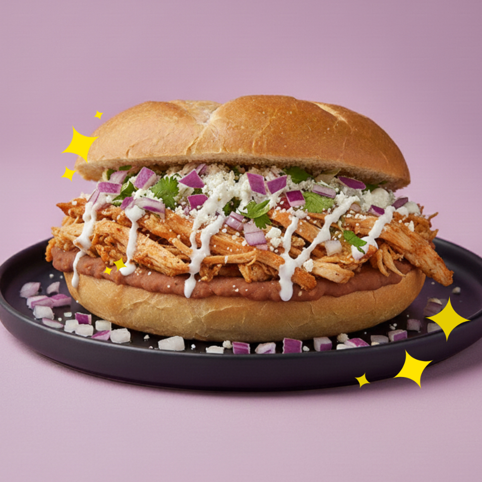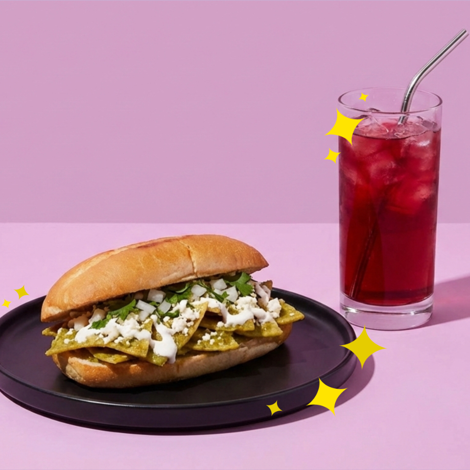 Torta con frijoles refritos y chilaquiles crujientes salteados en alguna de nuestras mágicas salsas.