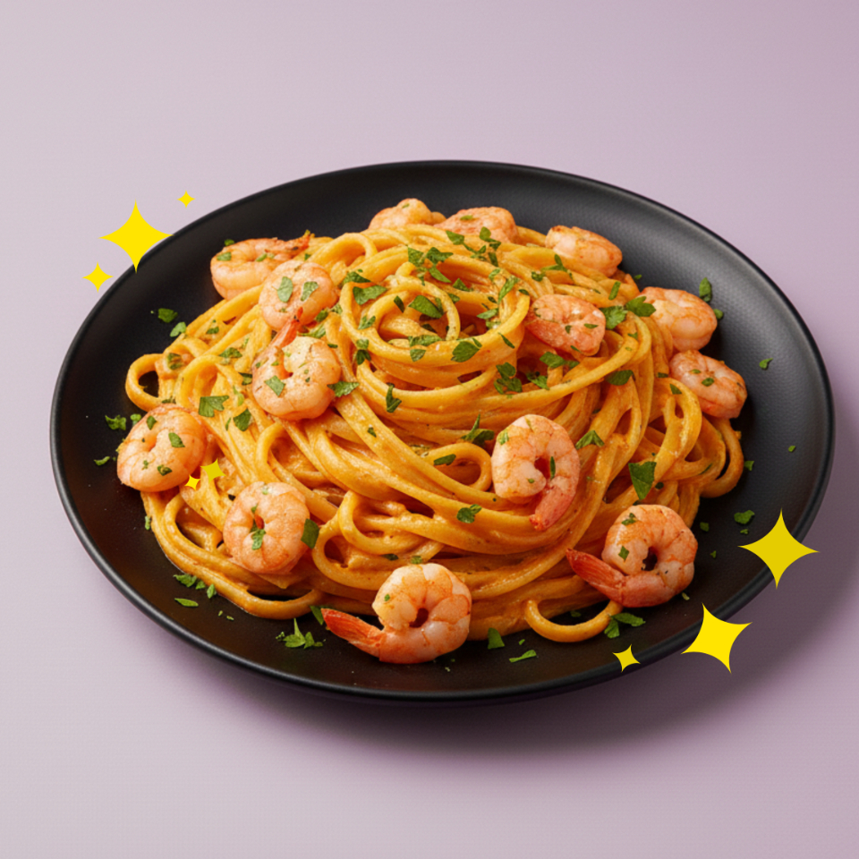 Fetuccini en salsa de chipotle con queso crema y camaroncitos en mantequilla.
