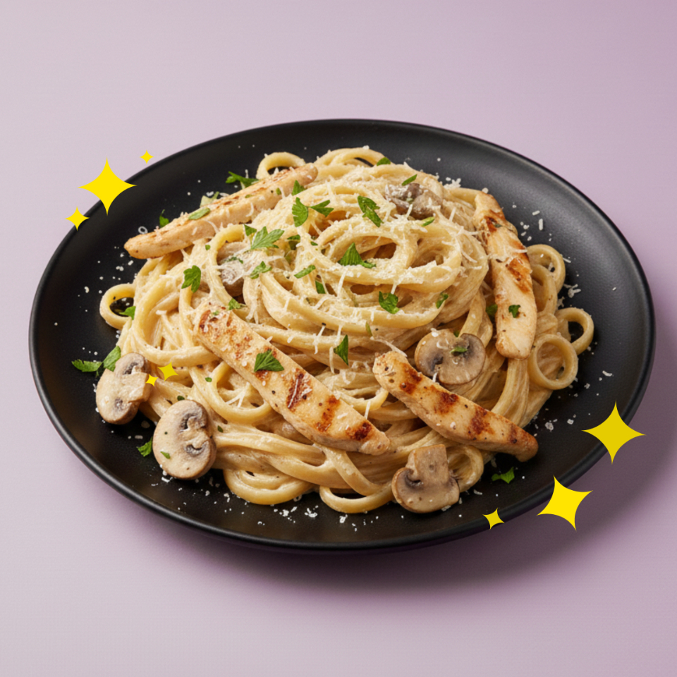 Fetuccini en salsa cremosa tipo Alfredo con champiñones y fajitas de pollo.