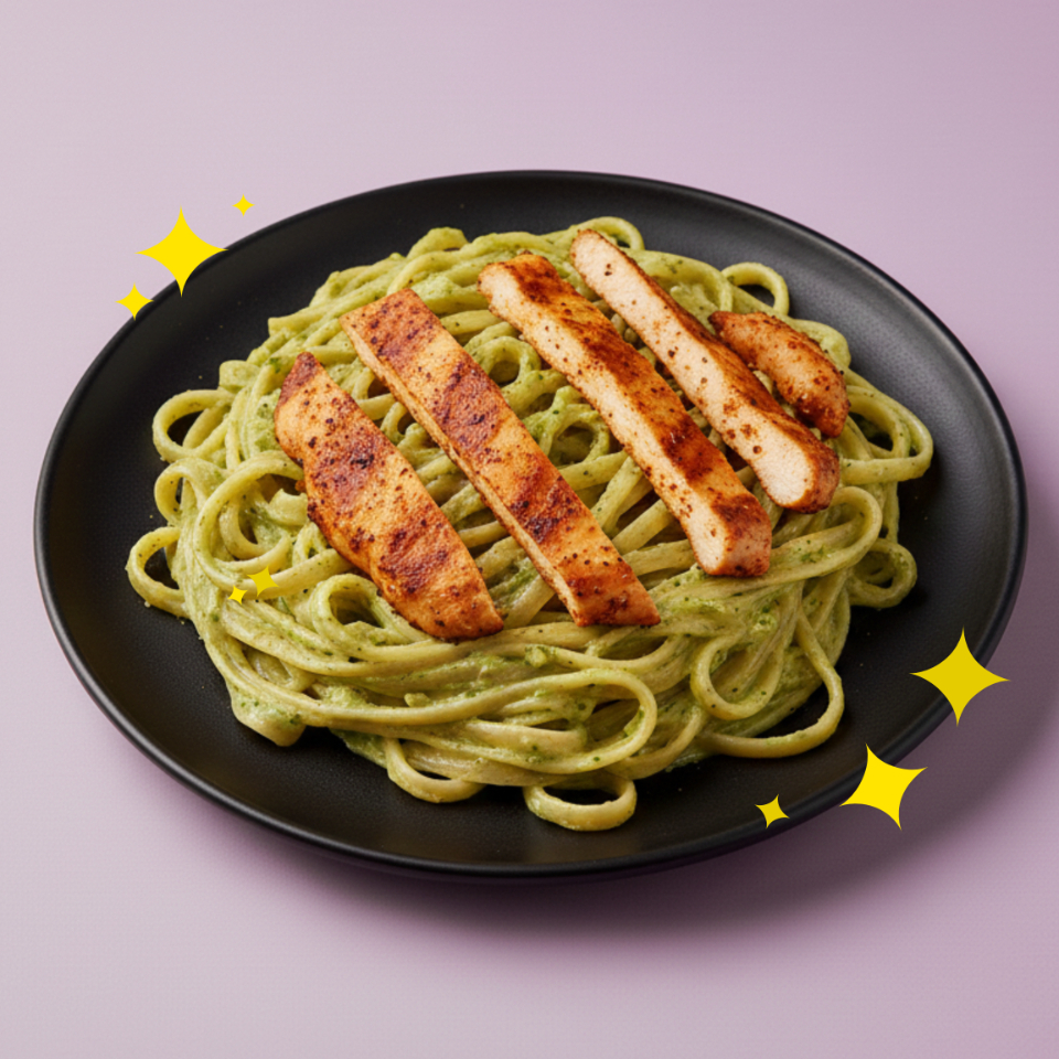 Fetuccini en salsa de chile poblano y queso crema, con fajitas de pollo pimentado al limón.