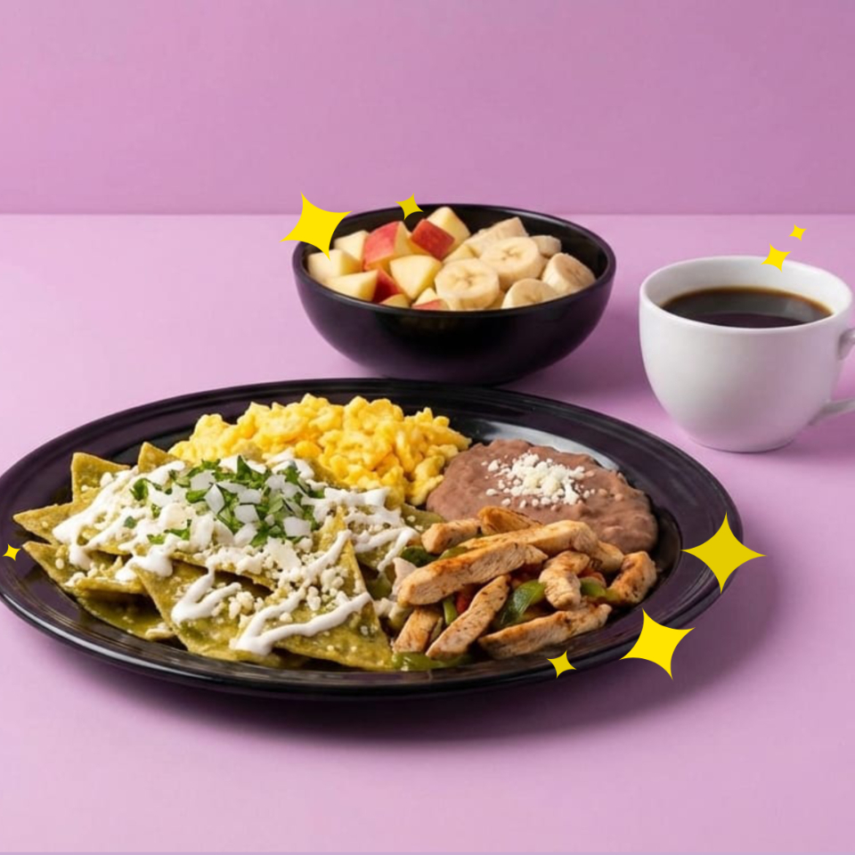Fruta + Chilaquiles con huevo revuelto, frijoles refritos y fajitas de pollo pimentado + Café de olla