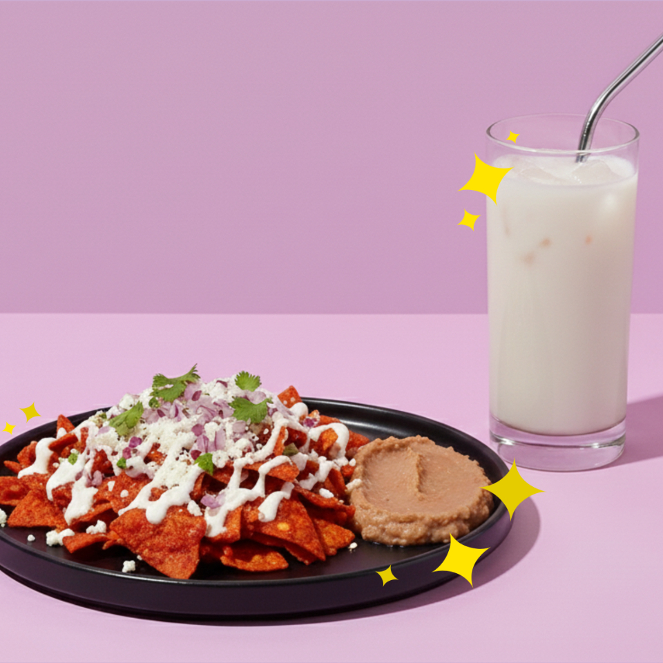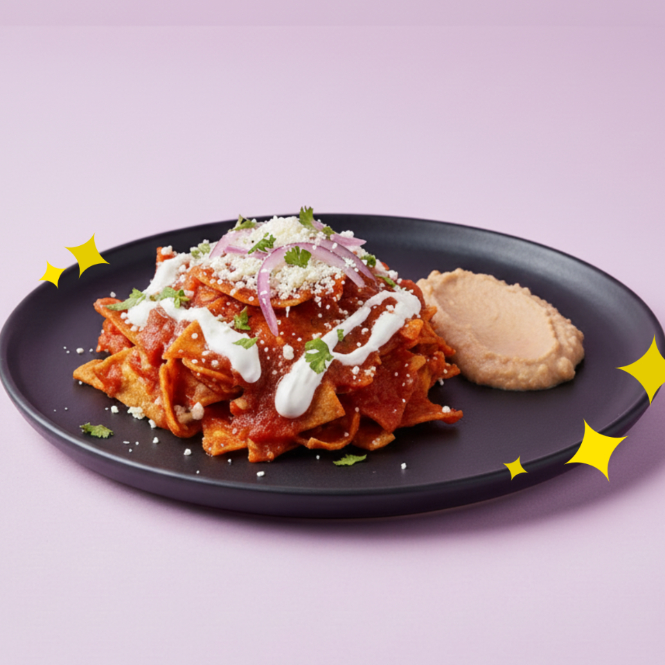 2 Chilaquiles hechos con intención, crujientes y deliciosamente salteados en nuestras mágicas salsas, acompañados de frijoles refritos.