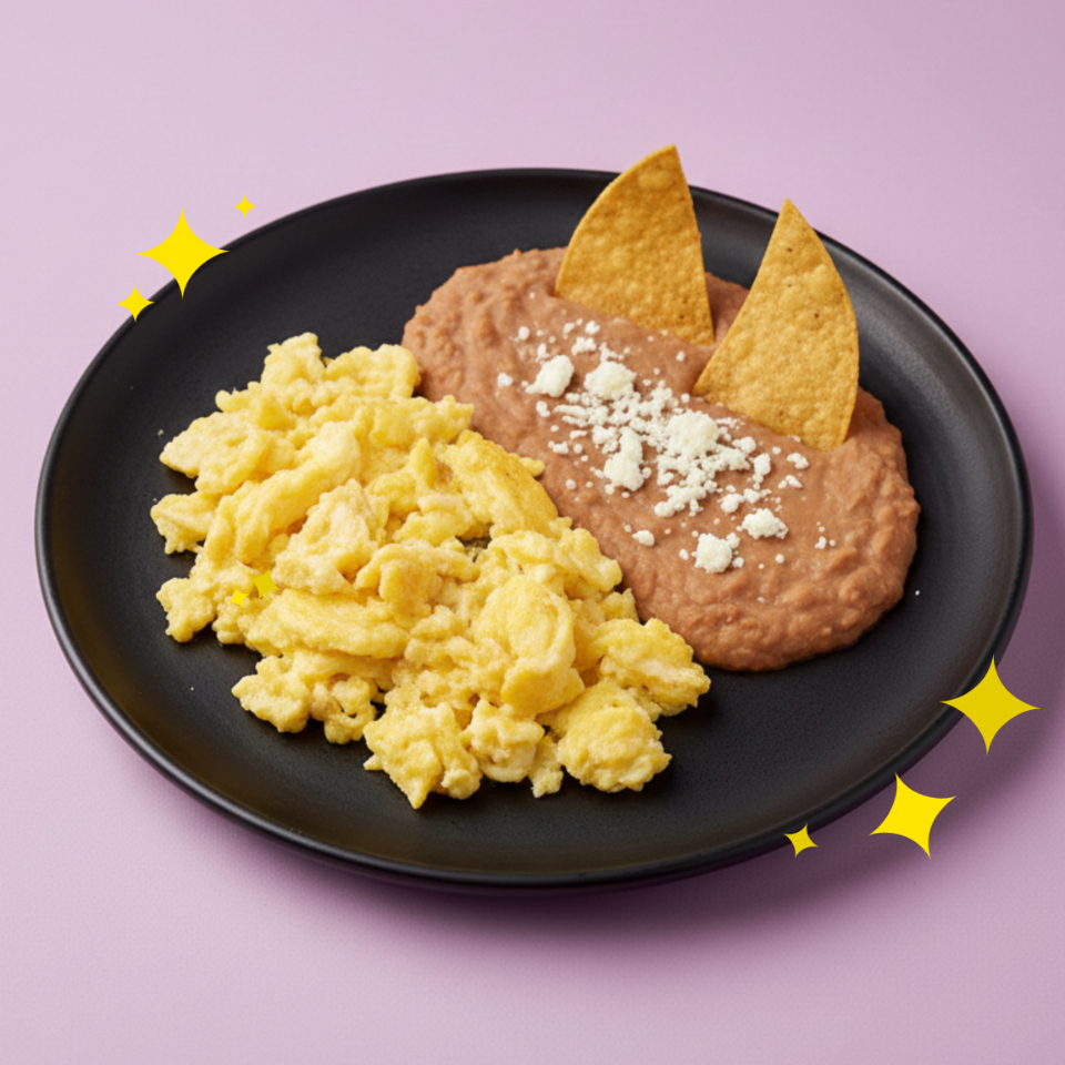 Huevos revueltos de casa con frijoles refritos.