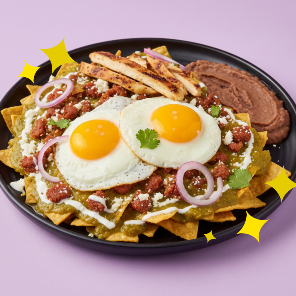 Chilaquiles con frijoles refritos acompañados de nuestras tres proteínas favoritas de nuestros comensales: Pollo Guisado + Chorizo + Dos huevos estrellados.