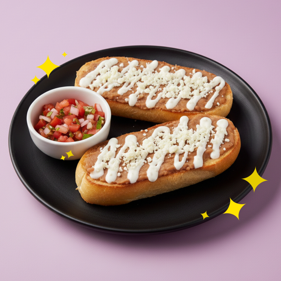 Orden de molletes de frijoles refritos con queso fresco y crema ácida, acompañados con salsa tipo pico de gallo.