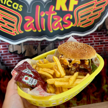 "Hamburguesa de boneless bañados en tu salsa de preferencia, con crema, mayonesa, queso manchego, queso americano, lechuga y jitomate, con Papas francesa"
