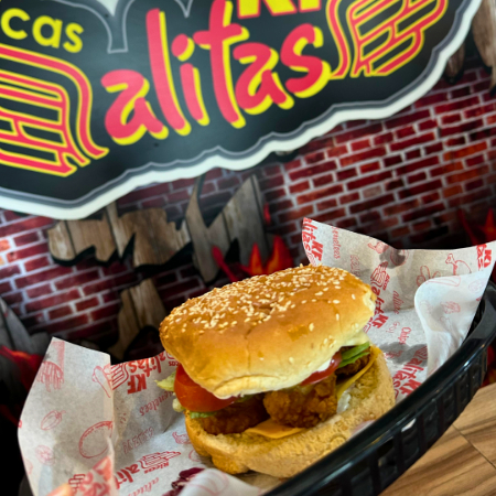 "Hamburguesa de boneless bañados en tu salsa de preferencia, con crema, mayonesa, queso manchego, queso americano, lechuga y jitomate."