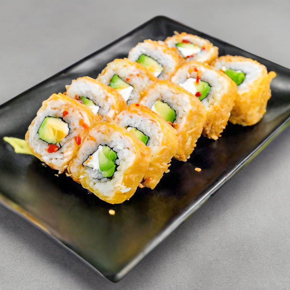 Rollo empanizado cubierto de cangrejo, relleno de aguacate, queso crema con Tampico encima.