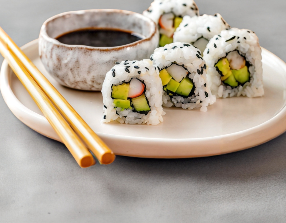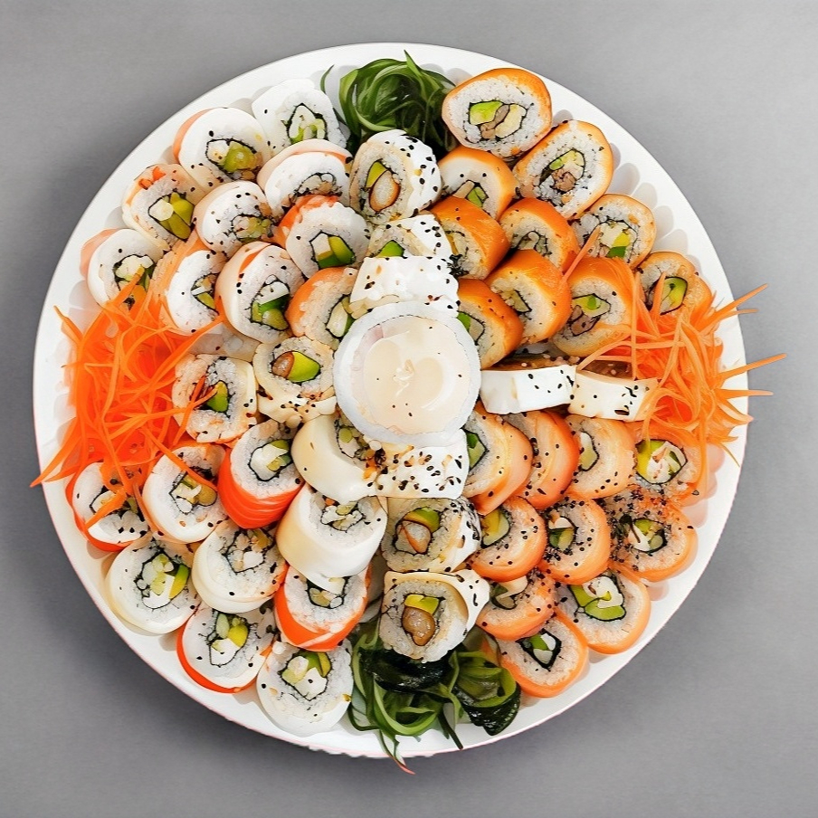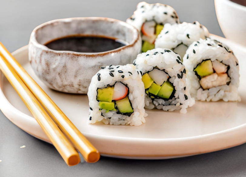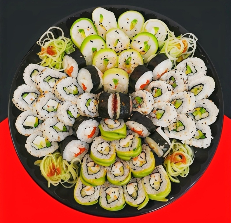 Rollo envuelto en queso crema, relleno de pepino, aguacate, pescado o marisco a elegir.