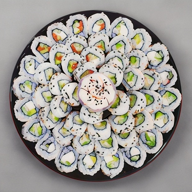 5 rollos California 1 camarón 1 salomón 1 cangrejo 1 tampico 1 vegetariano