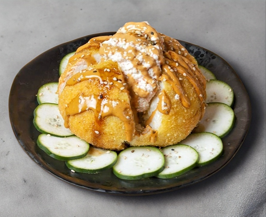 Bola de arroz cubierta de salmón, relleno de aguacate, camarón, queso crema con un toque de Tampico, chipotle y salsa de anguila.