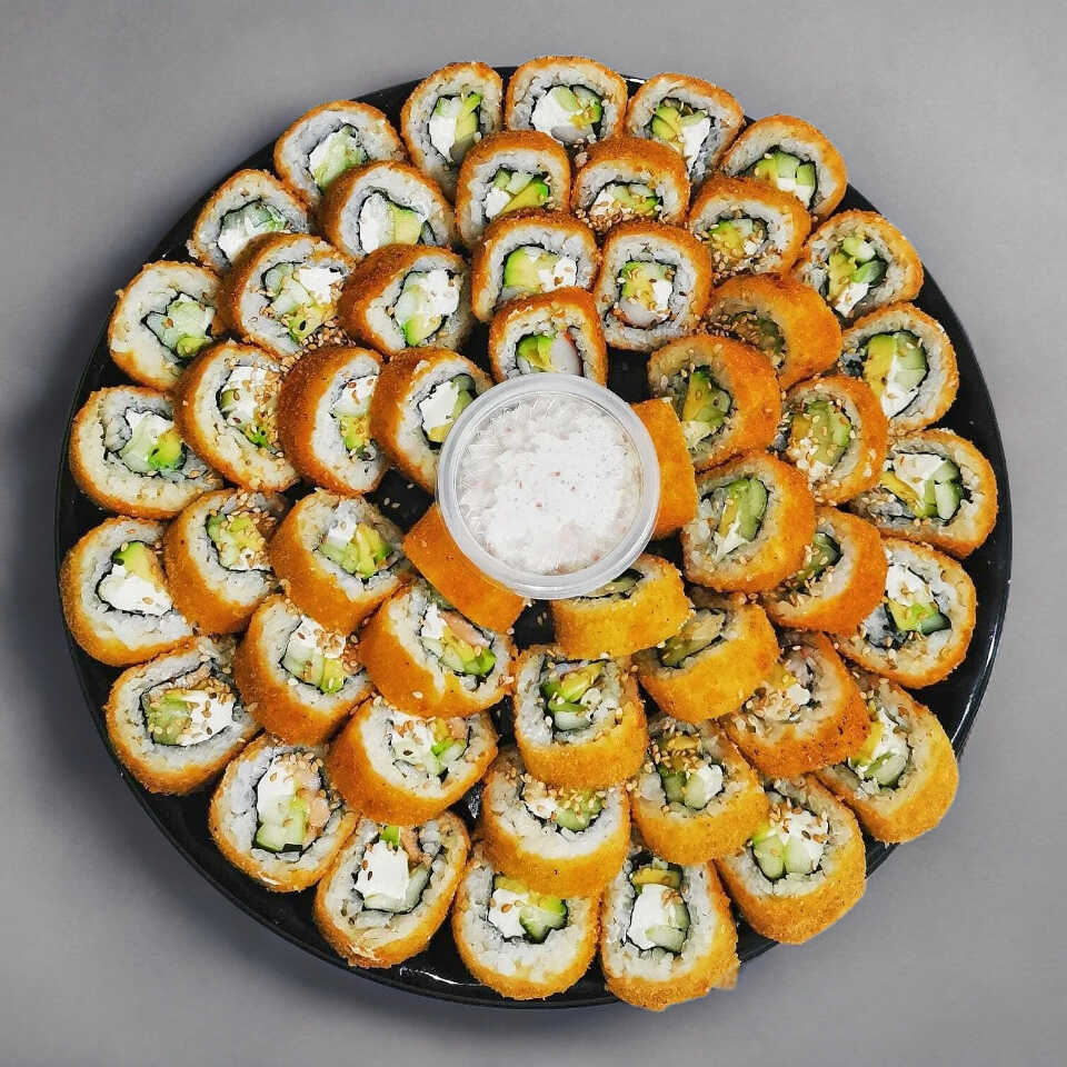 Charola rollos California empanizados 1 camarón 1 salmón 1 cangrejo 1 vegetariano 1 tampico