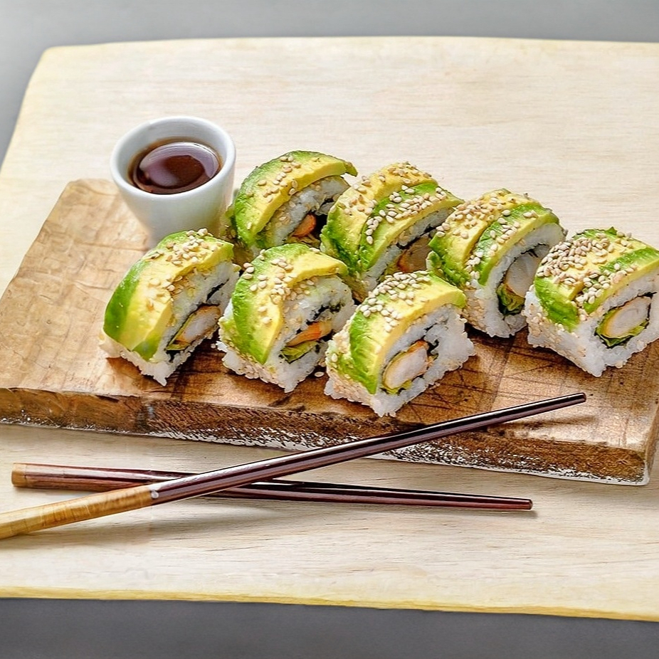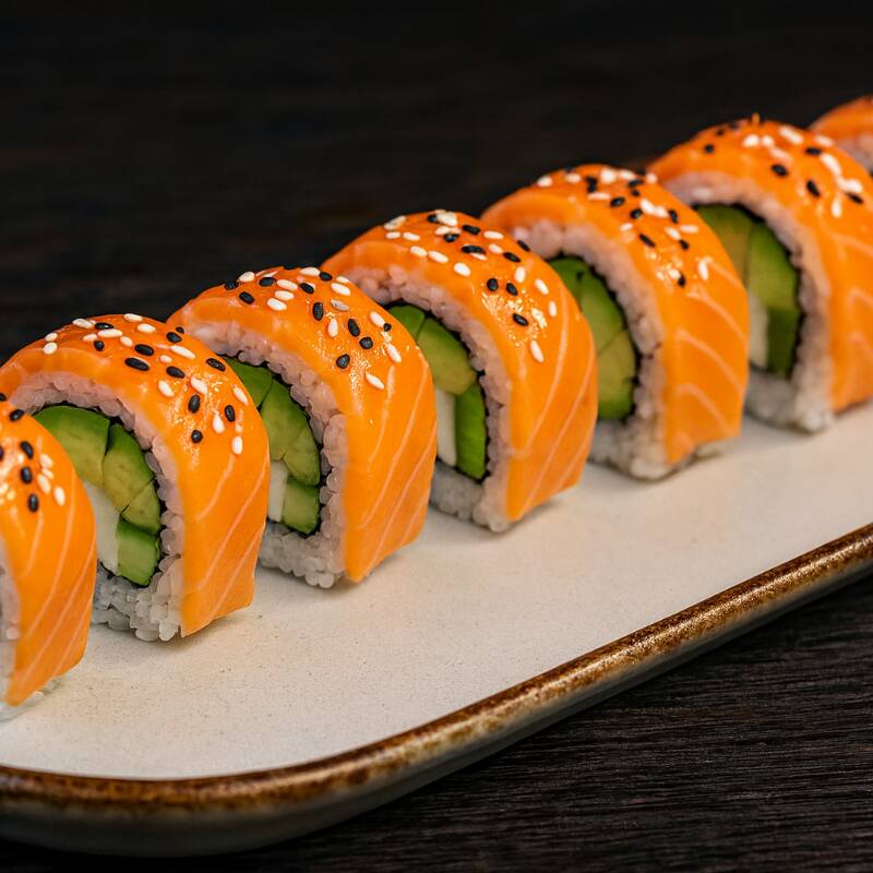 Rollo de 10 piezas con arroz por fuera y ajonjolí con alga; relleno de aguacate, pepino, queso crema y pescado o marisco a elegir.