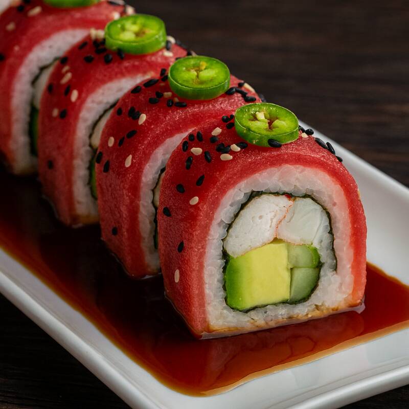 Rollo cubierto de atún , relleno de aguacate, queso crema, pepino
