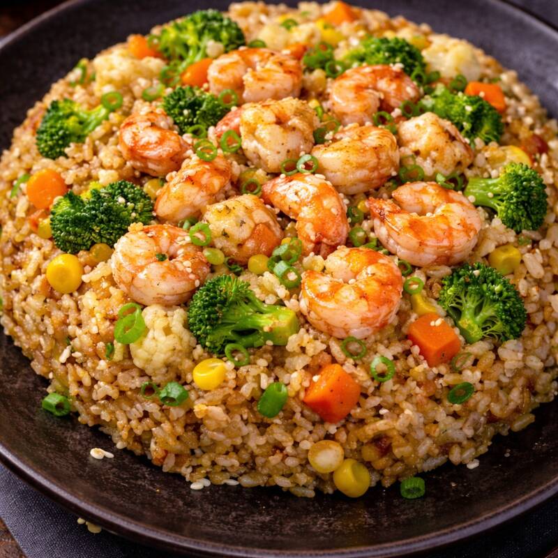 Arroz Yakimeshi ala plancha estilo japonés con verduras y camarones
