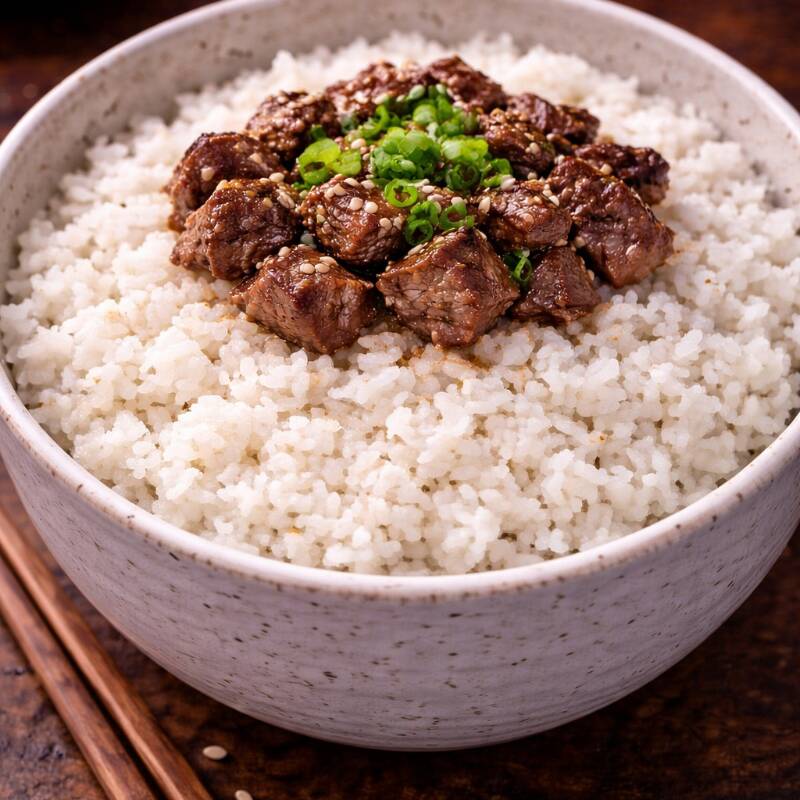 Arroz Blanco al vapor estilo japonés con Arrachera