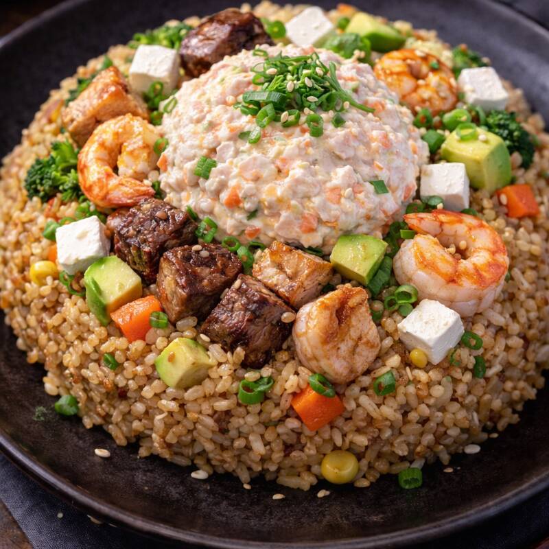 Arroz Yakimeshi ala plancha estilo japonés con verduras,polo,res,camarones