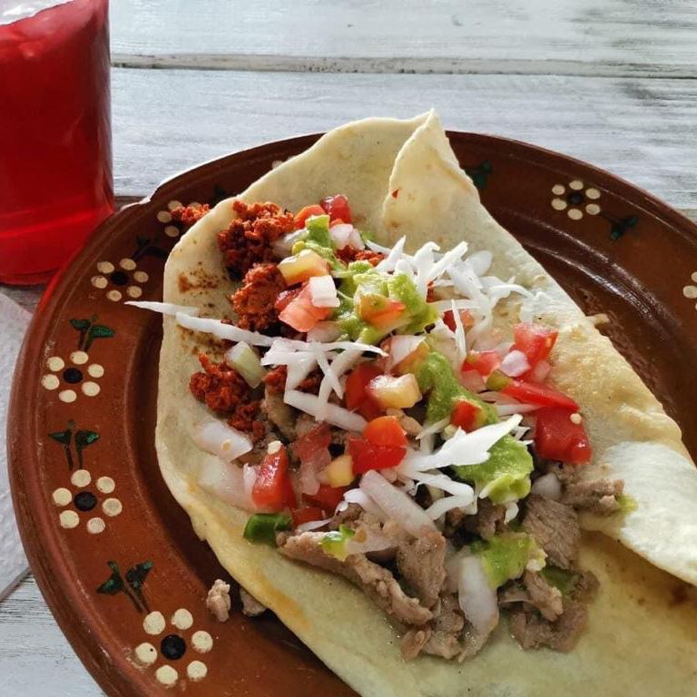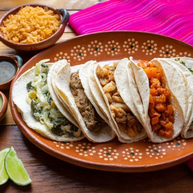 Tacos de tortilla de maíz con el guiso de tu preferencia, puedes acompañarlos con frijoles refritos.
