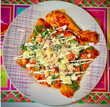 Crujientes totopos de maíz bañados en salsa roja o verde, coronados con crema, queso fresco y cebolla morada, acompañados de un guisado a elegir.