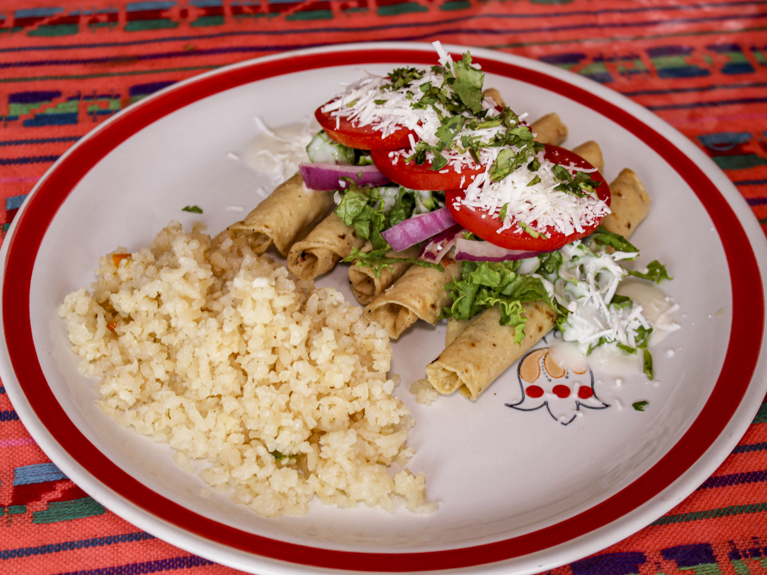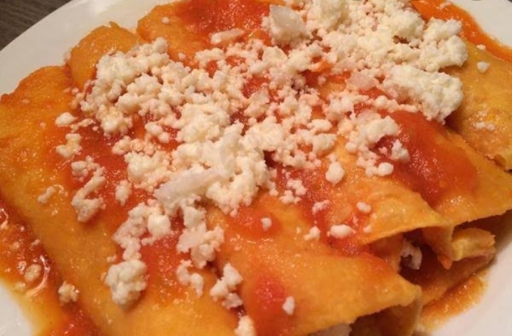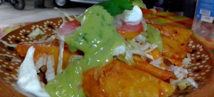 (Rollitos de tortilla con el relleno de su elección) ADORNADAS CON LECHUGA,, JITOMATE, CEBOLLA, CREMA Y QUESO RAYADO)