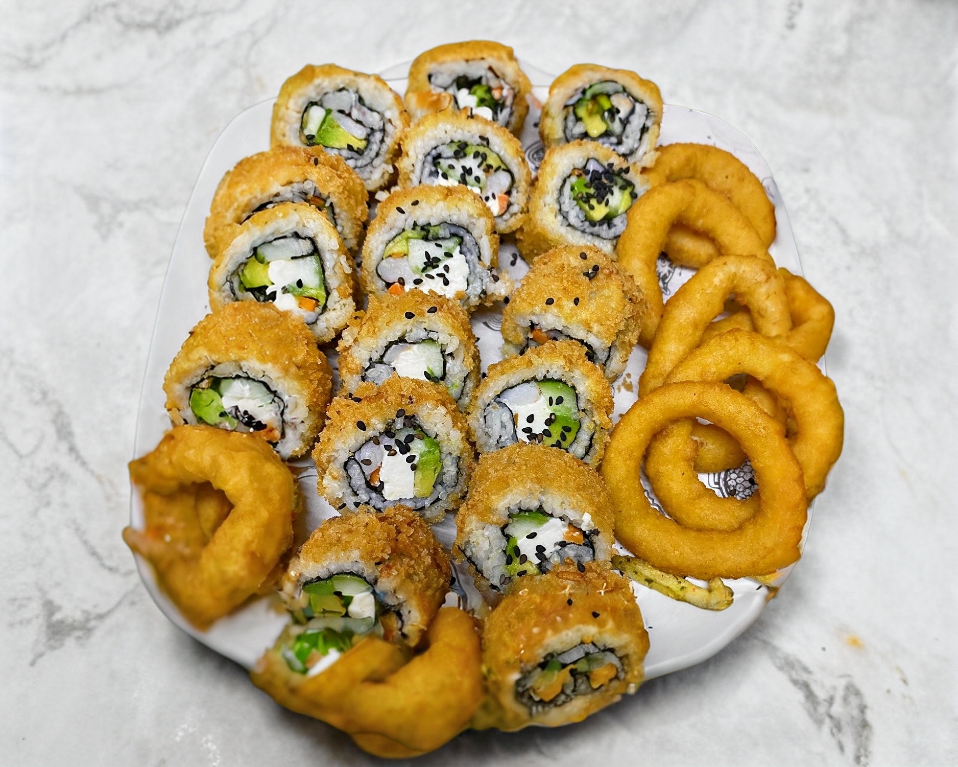 5 aros de cebolla*1 + Rollo de sushi*3 + Rollo primavera*3 + 10 Alitas*1