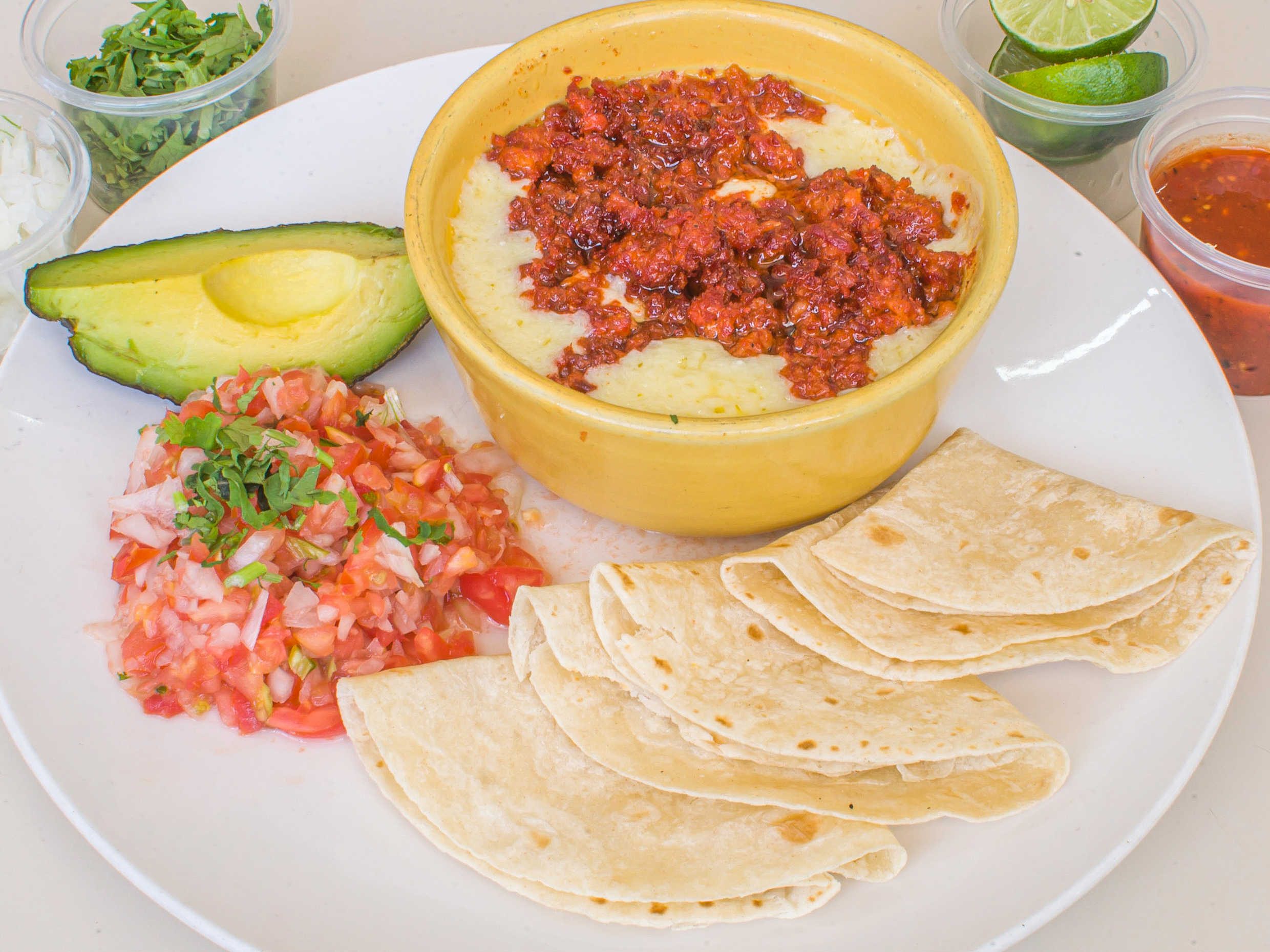 Acompañado de tortilla de harina y pico de gallo.