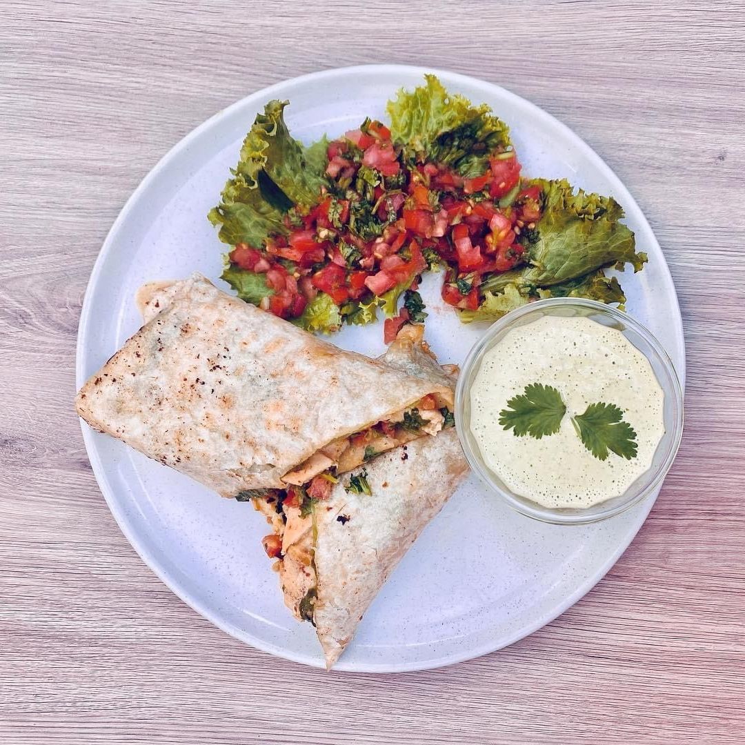 Tortilla de harina gigante rellena de pollo, pico de gallo, lechuga y la salsa especial de la casa.