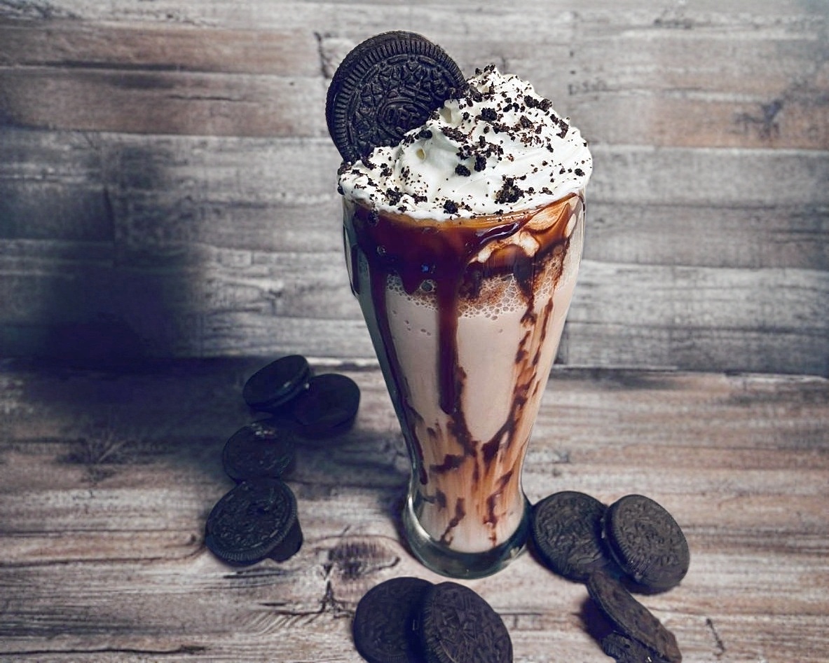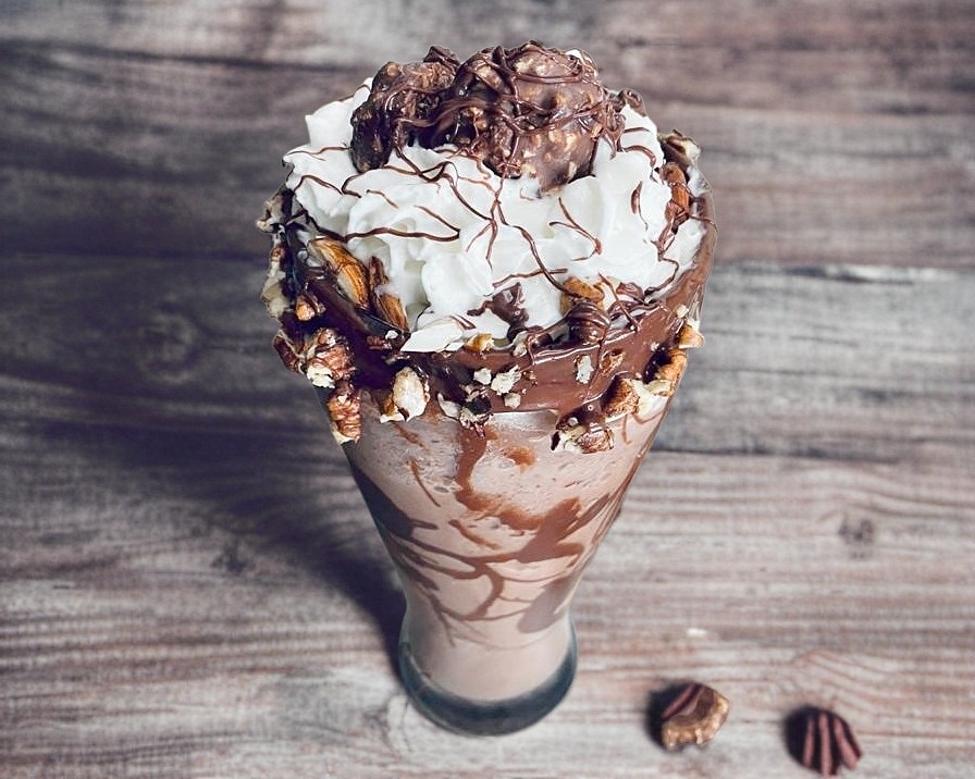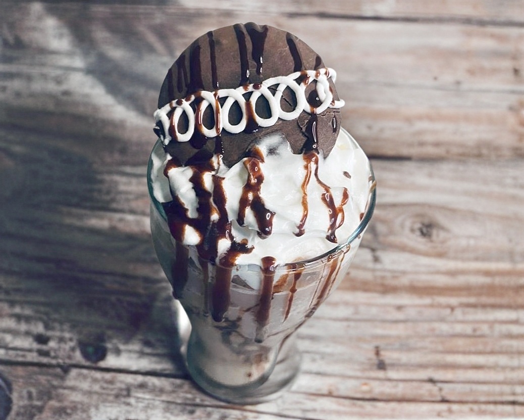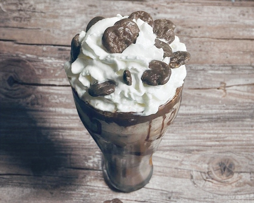 Malteada con base de helado, crema batida y chispas de chocolate.