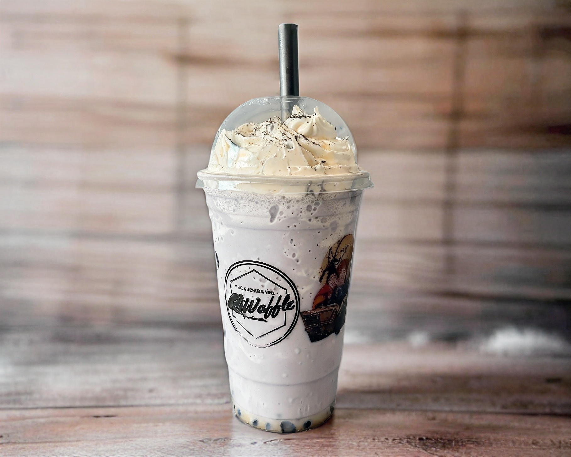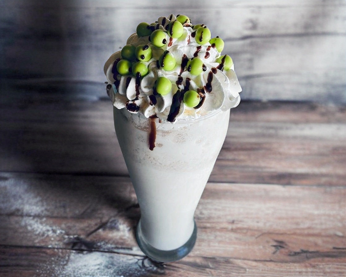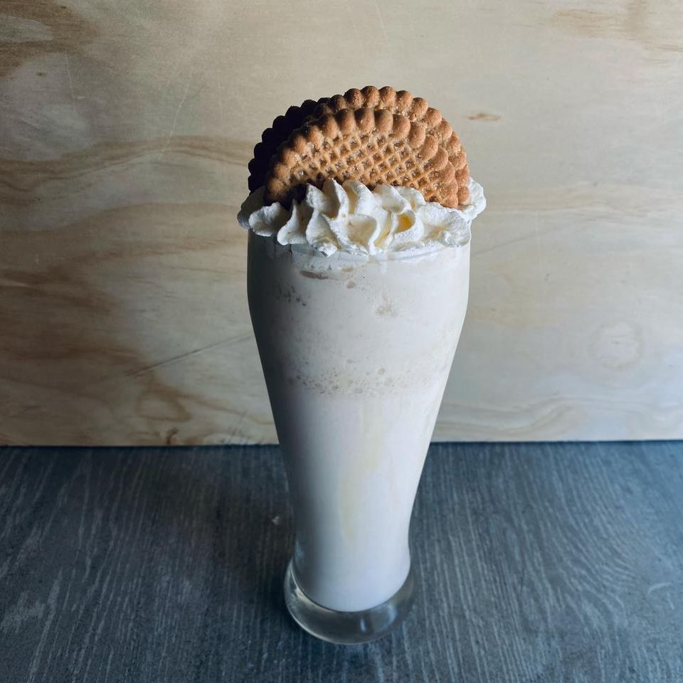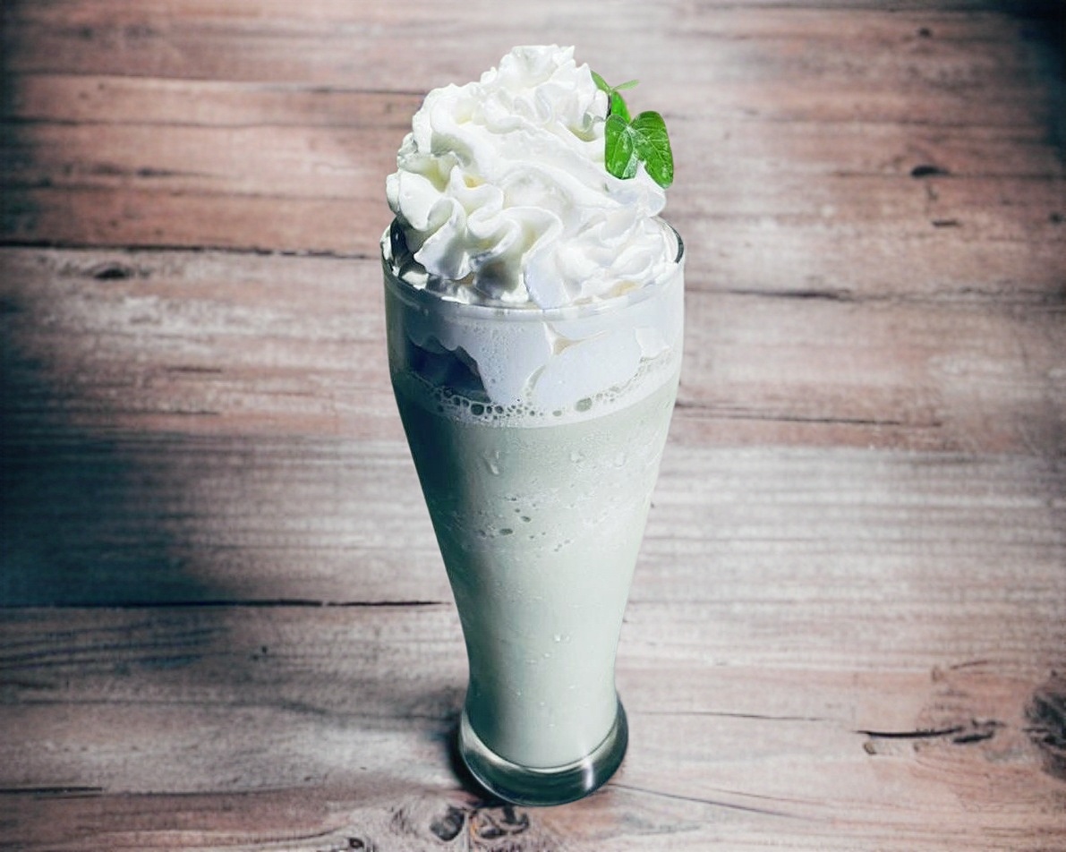 Malteada con base de helado, crema batida y chispas de chocolate.