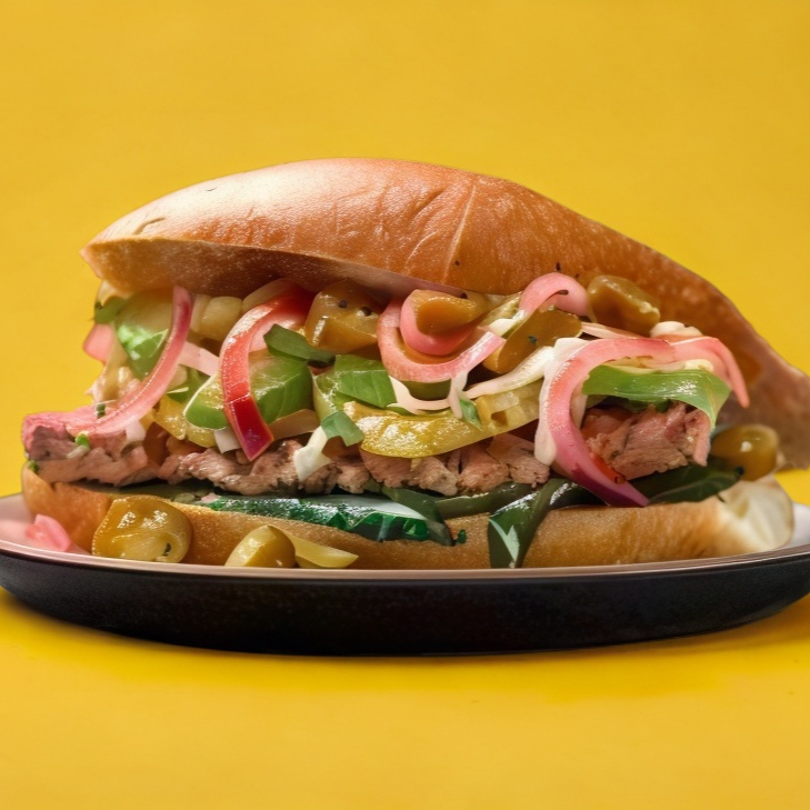 Lomo de cerdo adobado, queso, aderezos y verduras