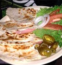Dos tortillas de harina, jamon, queso amarillo y blanco, verdura y catsup