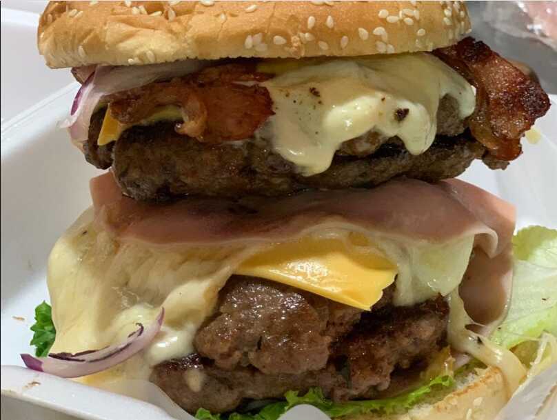 2 carnes de res, queso amarillo y blanco, tocino, piña, verdura y aderezos