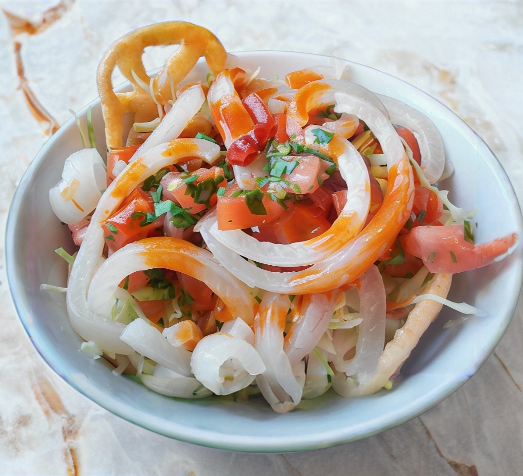 Cueritos, zanahoria infurtida, papa infurtida, lechuga, jitomate cebolla crema queso añejo